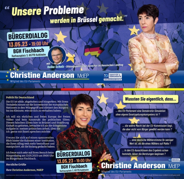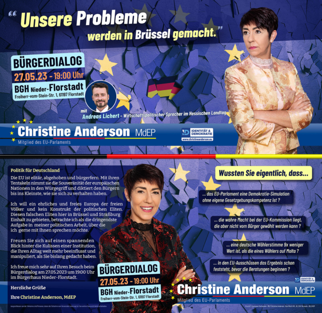 „Unsere Probleme werden in Brüssel gemacht!“ Meine Veranstaltungsreihe kommt diesmal in die Wetterau 🎤🔊💬 Bürgerdialog mit Christine Anderson (MdEP) &...