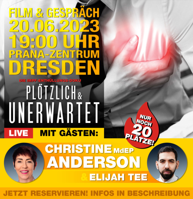 Am 20.06.2023 komme ich nach Dresden zu einer exklusiven Vorführung der Impf-Doku "PLÖTZLICH & UNERWARTET", der deutschen Synchronisation des schockierenden...