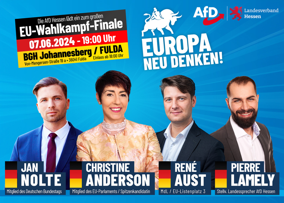 Ich lade Sie hiermit ganz herzlich ein zum großen EU-Wahlkampf-Finale des AfD Landesverbands Hessen am Freitag, den 07.06.2024 in Fulda. 💙🇩🇪💙