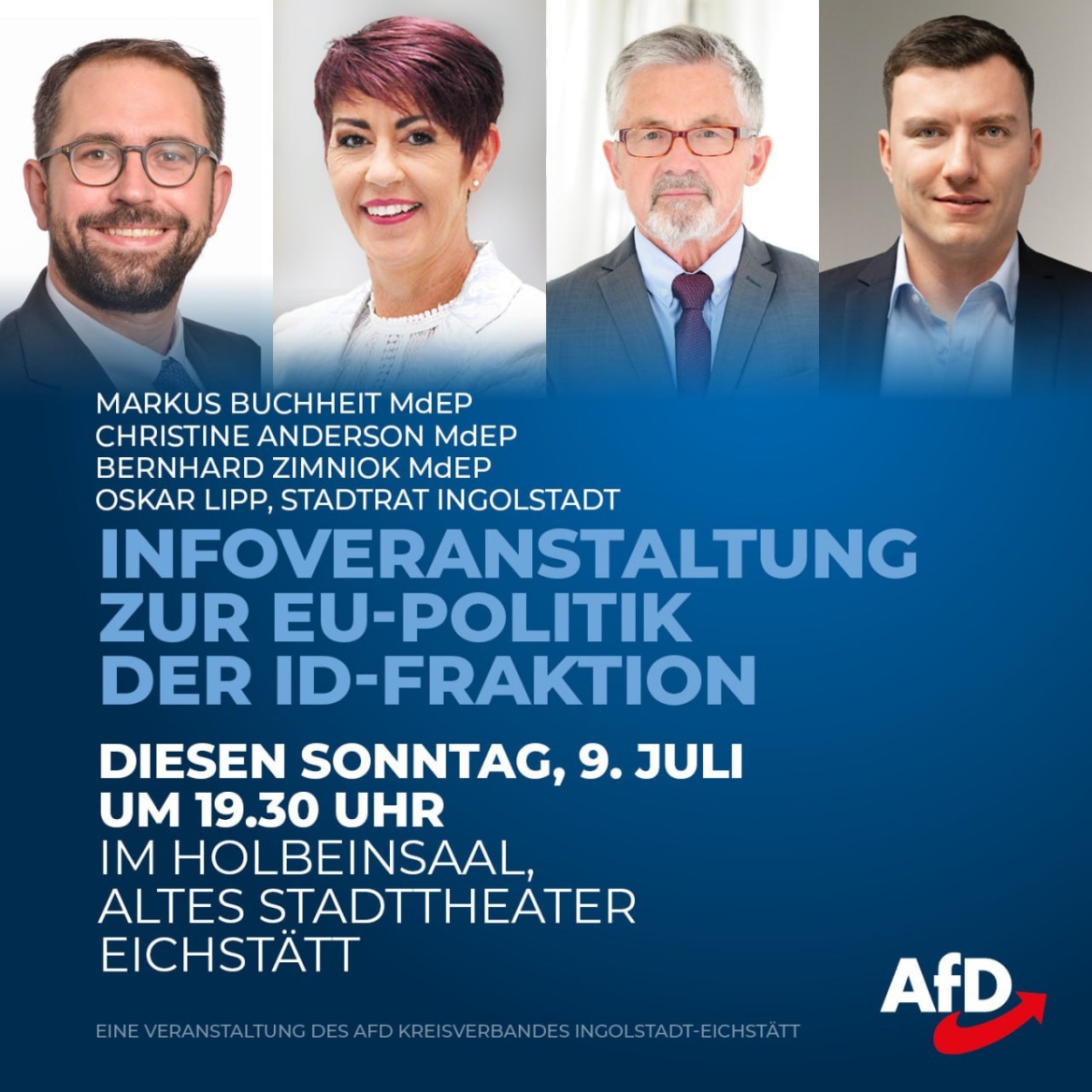 Zu Gast beim AfD Kreisverband Ingolstadt/Eichstätt werde ich diesmal zusammen mit meinen Kollegen aus dem EU-Parlament - Markus Buchheit (MdEP) und Bernhard Zimniok (MdEP) sowie dem Stadtrat Oskar Lipp (Ingolstadt) darüber berichten, wie die unseligen EU-Technokraten in Brüssel zielgerichtet ein Problem nach dem anderen für uns deutsche Bürger verzapfen - und was wir jetzt dagegen tun sollten. 🎤💬