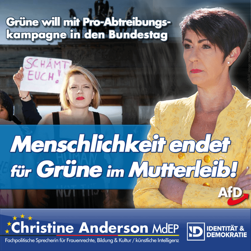 nach JUSO-Chef Kevin Kühnert fordert jetzt auch die GRÜNE Laura Dornheim die Abtreibung von Kindern noch bis zum Tag der Geburt. Faktisch möchte sie den §218 StGB damit abschaffen. Die Partei, die sich sonst über jedes geschredderte Küken entsetzt zeigt, scheint im Hass gegenüber menschlichen Ungeborenen nun jedes Maß verloren zu haben. Dies ist umso schlimmer, als dass unsere freiheitlichen Bürgerrechte bedrohter sind, als je zuvor, denn gegen den Nachwuchs hassenden "Linksblock" aus Grünen, SPD, FDP und ehemaligen SED-Vertretern, opponiert nicht einmal mehr die Union.